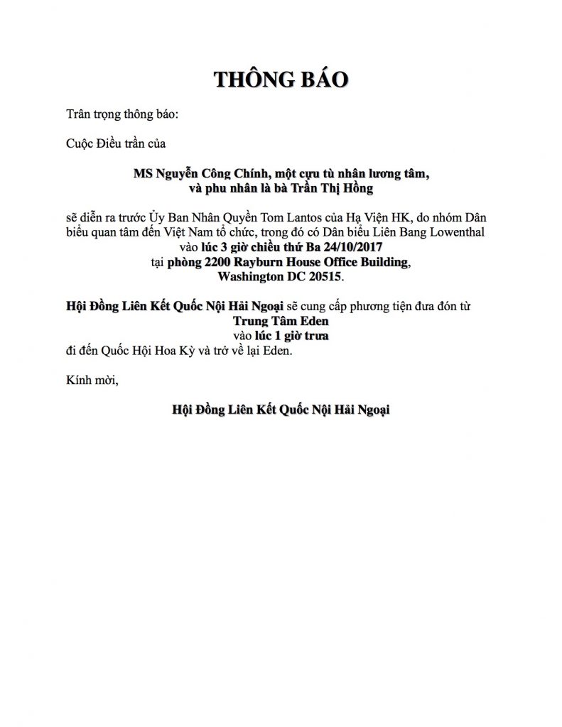 THÔNG BÁO Trân trọng thông báo: Cuộc Điều trần của MS Nguyễn Công Chính, một cựu tù nhân lương tâm, và phu nhân là bà Trần Thị Hồng sẽ diễn ra trước Ủy Ban Nhân Quyền Tom Lantos của Hạ Viện HK, do nhóm Dân biểu quan tâm đến Việt Nam tổ chức, trong đó có Dân biểu Liên Bang Lowenthal vào lúc 3 giờ chiều thứ Ba 24/10/2017 tại phòng 2200 Rayburn House Office Building, Washington DC 20515. Hội Đồng Liên Kết Quốc Nội Hải Ngoại sẽ cung cấp phương tiện đưa đón từ Trung Tâm Eden vào lúc 1 giờ trưa đi đến Quốc Hội Hoa Kỳ và trở về lại Eden. Kính mời,