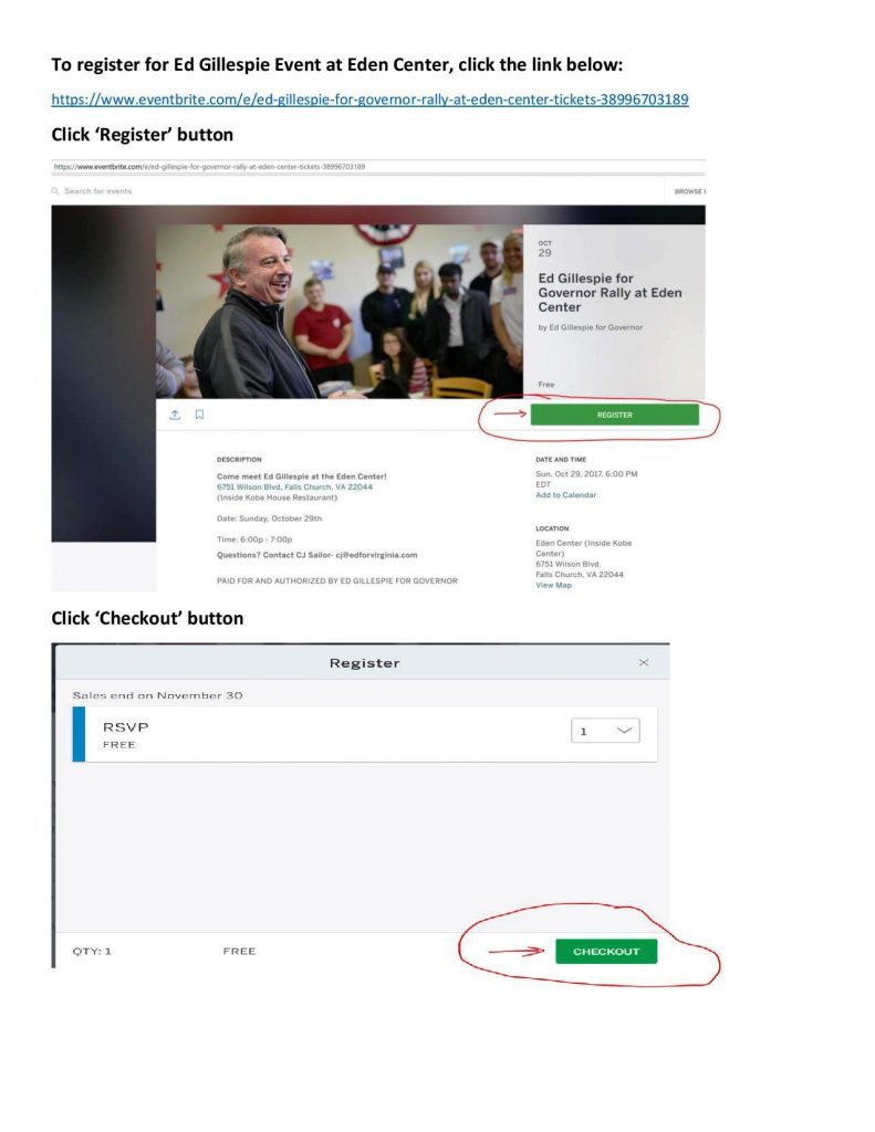 T BMH Washington, D.C Thư Mời Xin Quý Vị, Quý Anh, Chị, vui lòng click vào link bên dưới để ghi danh / register cho buổi gặp gở Ứng Cử Viên Thống Đốc, Đảng Cộng Hòa, Ông Ed Gillespie tại Nhà hàng Kobe House / Eden Center, ngày Chủ Nhật 10/29/2017, vào lúc 6 giờ chiều. Xin click vào link dưới đây: https://www.eventbrite.com/e/ed-gillespie-for-governor-rally-at-eden-center-tickets-38996703189 Sau đó: 1.- Click: Register 2.- Click: Check Out 3.- Click: Complete Registration Khi register, Quý Vị cần điền tên họ, địa chỉ, email, phone. Sau khi submit, Quý Vị sẽ nhận được email confirmation cùng với attached ticket dưới dạng pdf. Quý Vị có thể print ticket này để mang đến buổi gặp gở Ông Ed Gillespie. Kính, thân mời Quý Vị tham dự, và chuyển link này đến gia đình, thân hữu… cùng ghi danh / register tham dự… BMH Washington, D.C Xin xem Mẫu Ghi Danh / Register ở dưới: https://edforvirginia.com/event/meet-greet-ed-gillespie-falls-church/