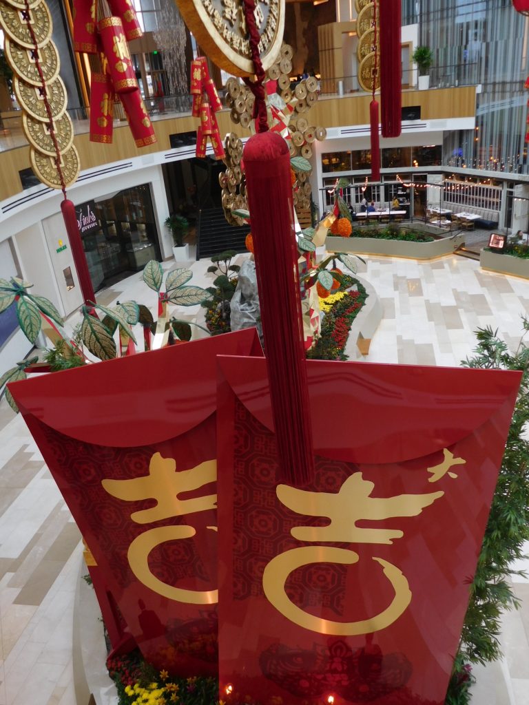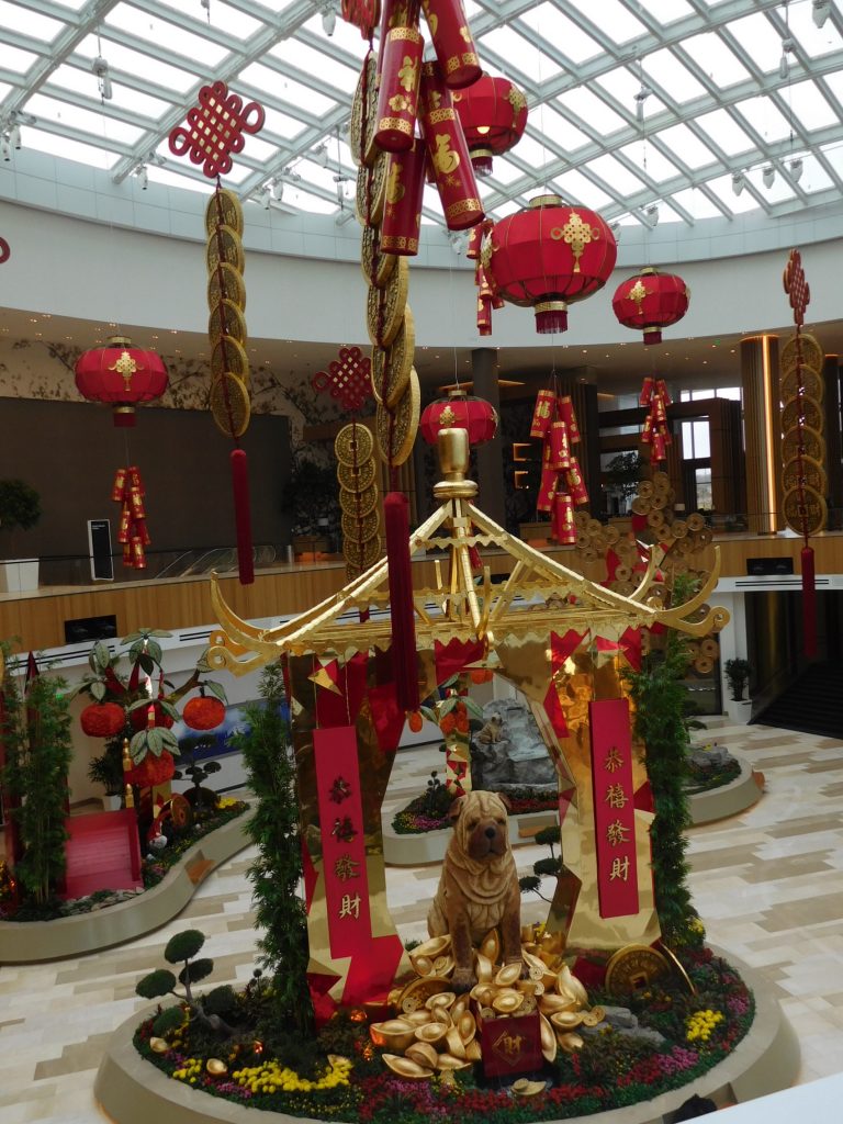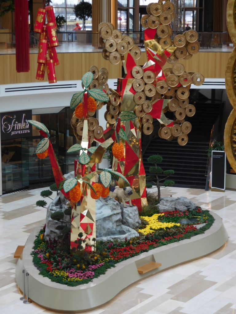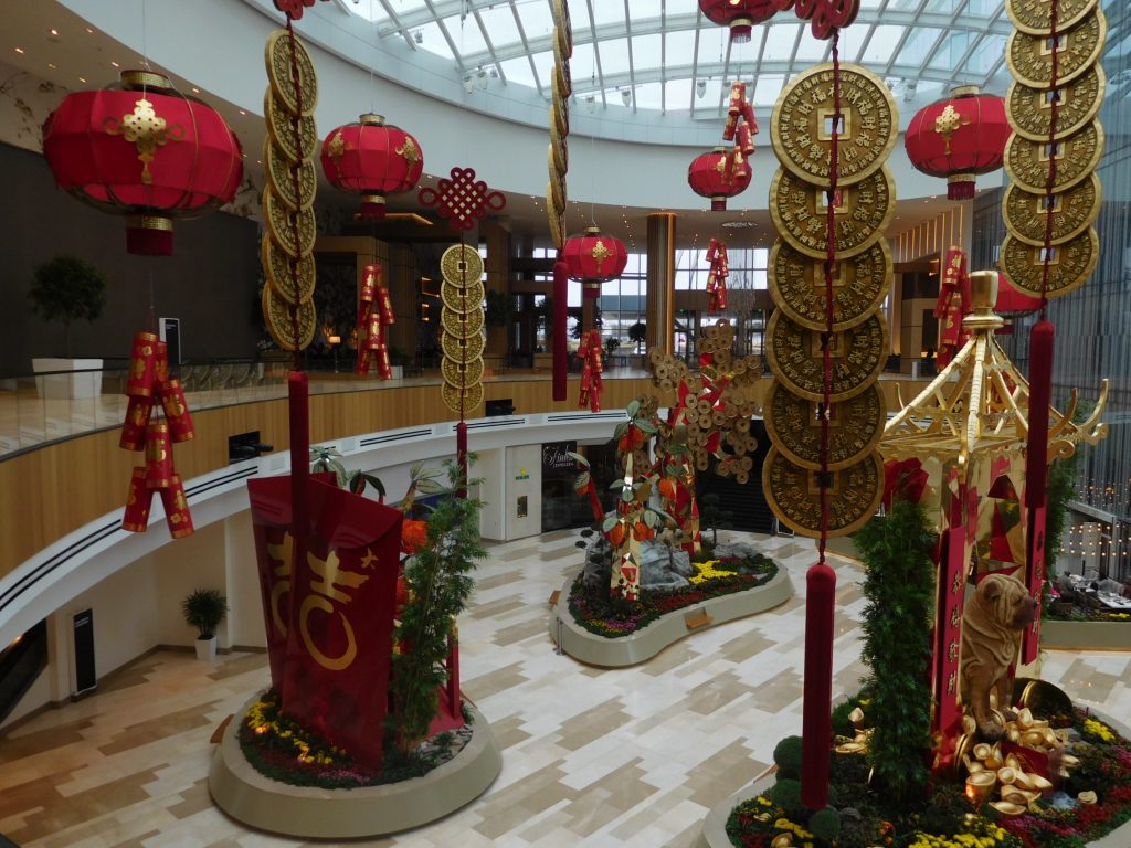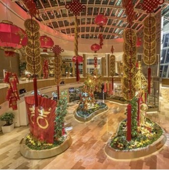 Tám chiếc lồng đèn Trung Hoa lớn, màu đỏ, cam và vàng rực rỡ, được treo từ trần nhà kiếng cao 85 ft bên cạnh các đồng tiền vàng. Để cho những trang trí này được hoàn hảo hơn là một giàn đèn sân khấu tác động lên những đồ vật trang trí, chiếu sáng 3 vườn hoa, cùng lúc là những bản nhạc truyền thống Trung Hoa được phát lên suốt ngày và đêm.